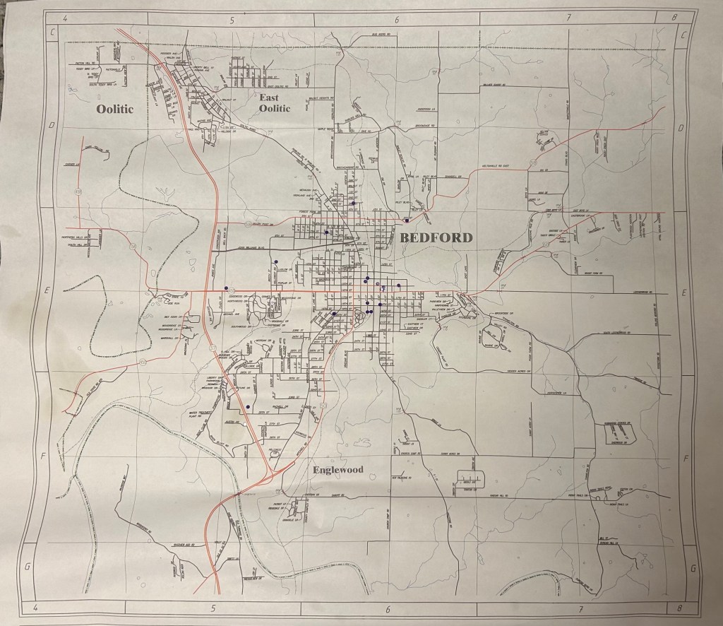 Here is a look at the map of Bedford. The purple dots are locations we know he visited.